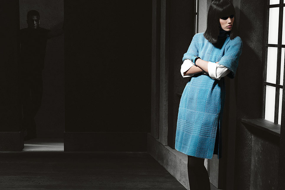 Платье с горлом и короткими рукавами из переливающегося твида. Блузка с длинными рукавами из креп-жоржета. Браслет из металла и органического стекла. Лаковый ремень с пряжкой из органического стекла.