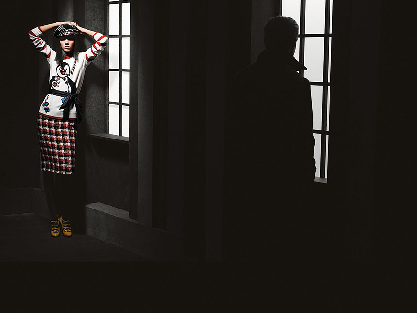 Шерстяной пуловер с набивным рисунком. Твидовая юбка с завышенной талией. Лакированные туфли с пряжками и металлическими каблуками со «стеганным эффектом». Платок из шелка и твида. Твидовый берет. Брошка из металла, страз и стекла «под жемчуг». Брошка из твида, металла и страз. Металлический ободок для головы, украшенный разноцветным стеклом и шелковым бантом.