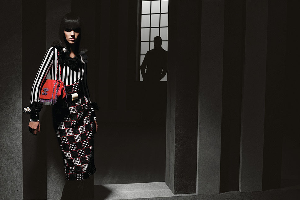 Полосатый шерстяной пуловер с вышивкой в виде камелии на воротнике и руковах. Рубашка из переливающейся твидовой ткани. Сумка из кожи ягненка, отделанная металлом по краям, с логотипом Chanel. Лакированный ремень с пряжкой из органического стекла.