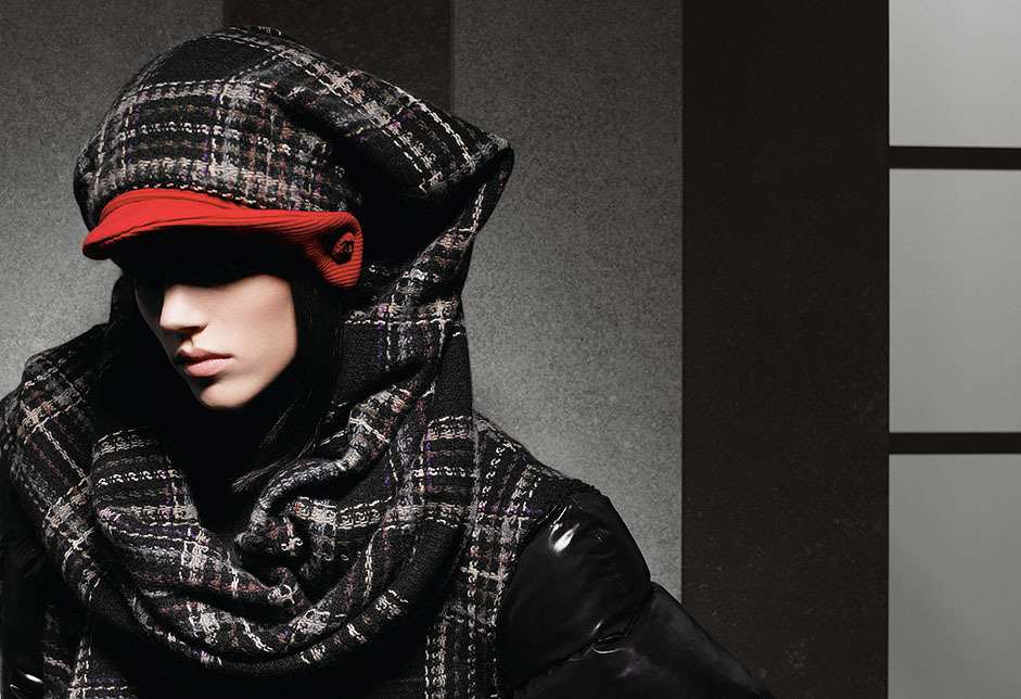 Твидовый жакет с соединяющимися рукавами из полиамидной ткани. Шарф-шапка из твида. Берет из твида.