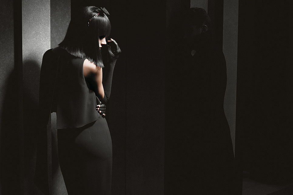 Платье из эластичного шелка и крепа. Длинные перчатки из кожи ягненкаи джерси. Металлический ободок для головы, украшенный разноцветным стеклом и шелковым бантом.