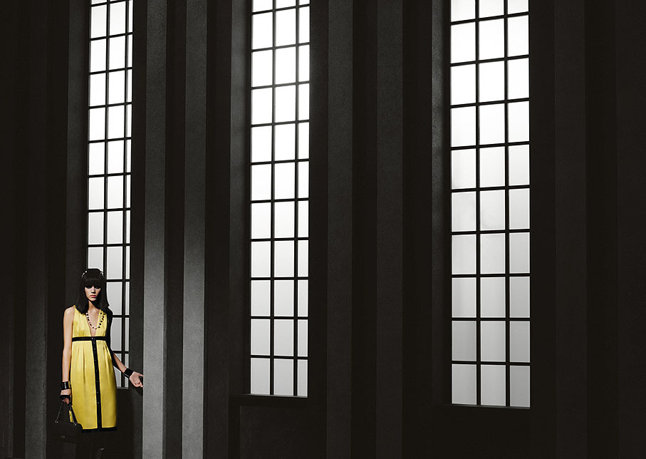 Платье из обычного и эластичного атласа. Брошь из металла и твида со стразами. Металлический ободок для головы, украшенный разноцветным стеклом и шелковым бантом.