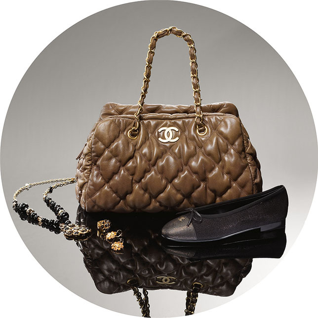 Крупная сумка с эффектом «облака» из кожи ягненка. Балетки с окантовкой из плотного шелка и прямым носом из лакированной кожи карунга. Колье из металла, пластмассы и декоративного стекла. Кольцо из металла и пластмассы. Серьги из металла и пластмассы.