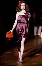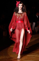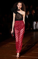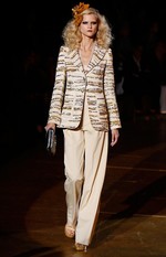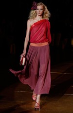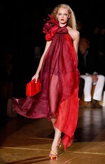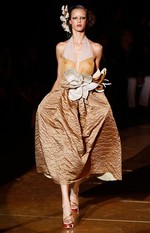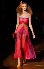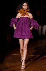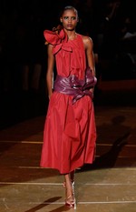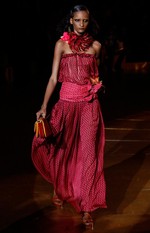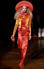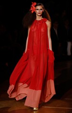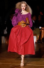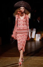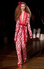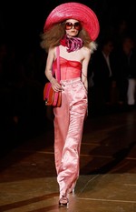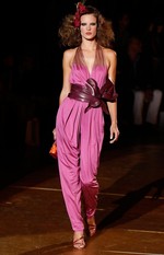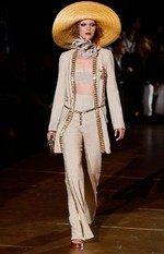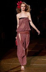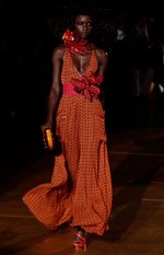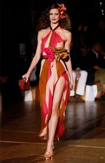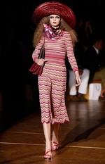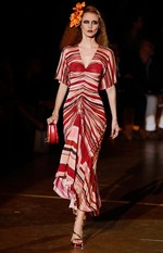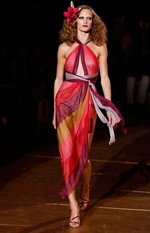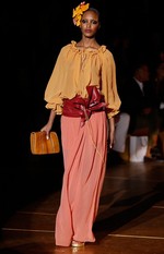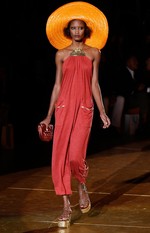 Безусловно, особое значение имеет цвет — это симфония роскошных фиолетовых, золотых, оранжевых и красных оттенков. Ритм задают геометрические узоры: мелкие зигзаги и круги, которые сменяют однотонные полотна и широкие полосы. Важные аксессуары: пояса и ожерелья с крупными цветущими орхидеями, а так же огромные круглые шляпы. фотографий: 54