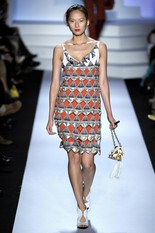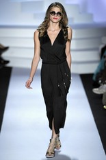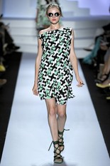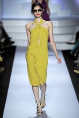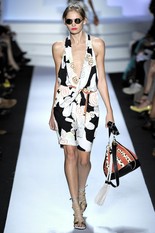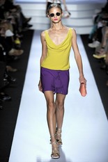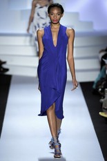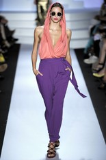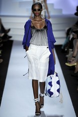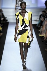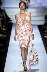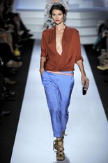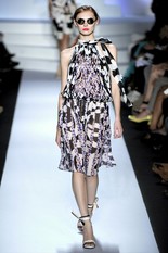 Показ женской коллекции одежды весна-лето 2011Diane von Furstenberg делает ставку на контрастные геометрические принты и чистые цвета. Современная европейская женщина, которая выбирает удобную, но эффектную одежду. Она надевает мужские брюки и свободную рубашку, но не забывает о красной помаде и глубоком вырезе на груди.
