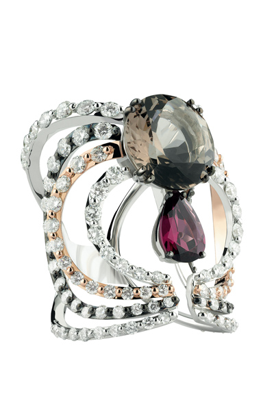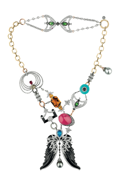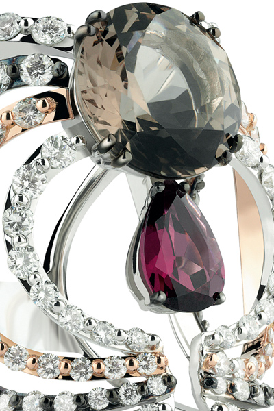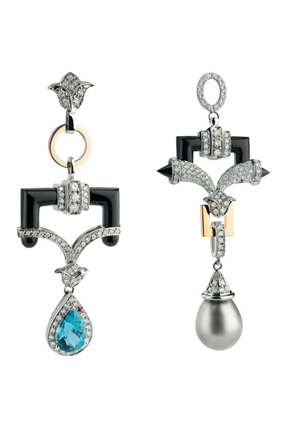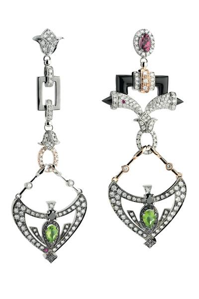 Damiani удалось уловить очарование эклектичности стиля Гальяно. Ювелиры смело микшировали разные оттенки золота, чёрные и белые бриллианты, японский жемчуг, хризолит, красный турмалин, родохрозит, голубой топаз, оникс и дымчатый кварц. О бренде John Galliano